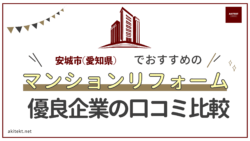 おすすめの会社を探す 【愛知県安城市】マンションリフォームのおすすめ優良企業3選!口コミ・評判で比較 愛知県安城市でマンションリフォームを検討しているけれど、どの会社に頼めば良いか分からない...そんなお悩みはありませんか?この記事では、Googleマップの口コミで特に評価の高い、愛知県安城市エリアのおすすめリフォーム会社を3社、厳選してご... 2025.09.27 おすすめの会社を探すマンションリフォーム